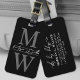 On the back, the background stays black with all text in crisp white. The phrase “This bag belongs to” appears in a script font, with your name and contact details shown in a mix of bold serif and script for a clean, stylish contrast. All colors can be customized, so you can adjust the background, initials, and text colors to suit your personal style. This custom luggage tag makes a practical and thoughtful gift for travelers—great for birthdays, holidays, or just because.