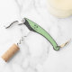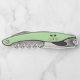 This corkscrew is light green with a black etching of the face of a cat with whiskers and green yellow eyes on a light green background.