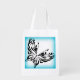 A reusable gocery bag with a pretty and ornate design of a black butterfly with swirly shapes and patterns. The background is white with a soft misty bright blue border.