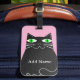 Black fat cartoon cat with green eyes. Cute cat character. Custom luggage tags with old print effect applied to the image. Pink background. Edit name to customize. Gift idea for cat lovers.