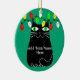 Black fat cartoon cat with green eyes. Cute cat character. Custom ceramic ornaments for Christmas decor. Green background. Edit text to customize. Gift idea for cat lovers.