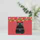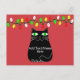 Black fat cartoon cat with green eyes. Cute cat character. Custom postcards for Christmas. Red background. Edit text to customize. Gift idea for cat lovers.
