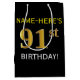 Black, Faux Gold 91st Birthday + Custom Name Medium Gift Bag
