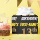 This wrapping paper design features a message like "FIRST-NAME’S 13th BIRTHDAY!", with the "13th" having a faux/imitation gold-like color appearance, and with the name and "BIRTHDAY" in a fun, bold font. The name is customizable, and the background is colored black. Wrapping paper like this could perhaps be used when wrapping birthday gifts being given to somebody in celebration of their thirteenth birthday. [~Z0000203]