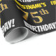 This wrapping paper design features a message like "FIRSTNAME’S 75th BIRTHDAY!", with the "75th" having a faux/imitation gold-like color appearance, and with the name and "BIRTHDAY" in a fun, bold font. The name can be customized, and the background is colored black. Wrapping paper like this could perhaps be used when wrapping birthday gifts being given to somebody in celebration of their seventy fifth birthday. [~Z0000203]