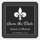 Elegant and simple Wedding Save the Date Stickers featuring a fleur de lis against a black background. This design is a unique choice for announcing a modern wedding. Easy to customize with your wedding details. Click "Customize It" to find more personalization options.