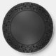 Black ornate floral circle on iridescent black texture background. Luxury monochromatic design.