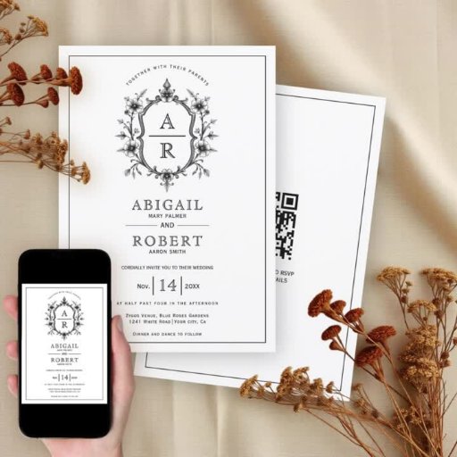Elegant black and white vintage yet modern floral crest monogram wedding RSVP Card with QR code. This elegant wedding RSVP card features a sophisticated design that blends vintage charm with modern convenience. A beautifully crafted, black floral crest serves as the centerpiece, showcasing the couple's initials in a refined monogram. The delicate floral details evoke a sense of timeless romance. To simplify the RSVP process, a prominently displayed QR code is included on the back of the card, allowing guests to quickly and easily RSVP online via their smartphones. This thoughtful addition streamlines the response collection and adds a contemporary touch to the vintage-inspired aesthetic.