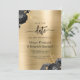 This elegant wedding save the date card features black floral bouquets set off with gold faux foil greenery in two corners, on a gold fauxbrushed metal background. The customizable text combines black serif, italic and handwriting fonts. The reverse side features a matching black and gold floral design.