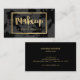 This elegant designer card template features a handwritten text treatment for "Makeup" followed by your name or business name for a beautiful brand identity on this business card for makeup artists. Created in a faux metallic gold foil effect with a dark gray and black floral pattern in the background for added depth. This double-sided card allows ample room on the backside for your contact info.