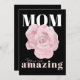 Say it like it is. A large single watercolor bloom dominates the center of this card. On a black background the message "Mum, you're amazing" is set in large modern typography in white and matching pink. On the reverse, a small wreath of blooms and foliage encircle " with love" on a white space where you can custom add your name or delete the name and hand write your own message.