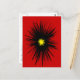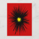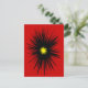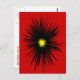 This postcard features a dramatic abstract design of a black flower with a golden yellow center on a scarlet red background.