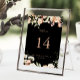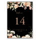 This black formal royal floral wedding table number is perfect for a modern wedding. The design features watercolor pink, blush, and white elegant flowers with emerald green leaves.