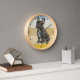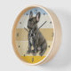 On this clock is a beautiful image of a black French Bulldog. The image is placed on a retro, slightly distressed striped sunset background. Dark numbers and diamond shaped markers around the perimeter make the clock easy to read. Perfect for anyone who has lost their heart to a little Frenchie.