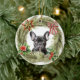 This pretty Holiday ornament features an adorable black French Bulldog. The dog is framed with a pine bough wreath decorated with a red, green, and gold star which the dog is looking at. Also included is a striped bow and poinsettia and holly with red berries. The back of the ornament has the same wreath, with two text fields for you to customize.