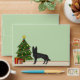 Destei's original cartoon illustration of an adorable black color German Shepherd breed dog. The dog is standing by a festive Christmas tree decorated with red and yellow ornaments, a white pearl garland and a yellow star that is placed on the top of the tree. There are also two wrapped presents by the tree. The floor color is beige and the background color is light green.