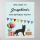 Destei's original cartoon illustration of an adorable black color German Shepherd breed dog. The dog is placed in a colorful birthday setting. There is a birthday cake with some candles on it, colorful birthday balloons and a bunting banner as well as two present boxes.