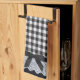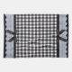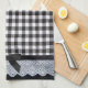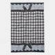 16” x 24” kitchen towel with an image of black gingham. White eyelet, black ribbon and black bow detail.
