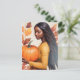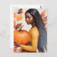 This postcard features oil painting artwork of a beautiful black girl with very long hair holding a pumpkin in an autumn theme. Fall leaves in brown, orange, and red complete the autumncore picture of warm colors. Perfect for October and November harvest season!