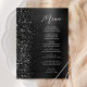 This elegant modern wedding menu features a faux diamond glitter border on a black faux brushed metal background. The customizable text combines white handwriting script and sans serif fonts. The black brushed metal and glitter design is repeated on the reverse side.