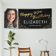 Personalized fortieth birthday party banner featuring a stylish black background that can be changed to any color, a photo of the birthday boy/girl, gold sparkly glitter, the words "happy 40th birthday" in a faux gold foil script, their name, and the date.