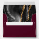 The inside of this elegant modern wedding invitation envelope features a black watercolor agate design trimmed with faux gold glitter. Customize the back flap with the names of the couple in gold-colored handwriting script and return address in copperplate font on a burgundy background.