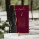 The left-hand edge of this elegant modern wedding table number card features a black watercolor agate border trimmed with faux gold glitter. The word "table" appears in gold-colored handwriting script on a burgundy red background. Add the names of your guests who are assigned to each table.