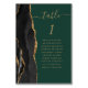 The left-hand edge of this elegant modern wedding table number card features a black watercolor agate border trimmed with faux gold glitter. The word "table" appears in gold-colored handwriting script on an emerald green background. Add the names of your guests who are assigned to each table.