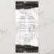 This elegant, modern wedding program features black watercolor agate top and bottom borders trimmed with gold faux glitter. The text appears in elegant gold-colored handwriting and black copperplate font on a gray and white marble background.