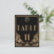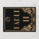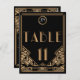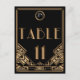 An ornate wedding table number 11 (eleven) postcard in the sought-after Art Deco style of The Great Gatsby. A complex geometric frame with straight lines and sweeping curves is subtly colored in varying shades of golden beige to simulate a gold effect against the jet black background. This distinctly stylized vintage design aesthetic from the 1920's era has seen a resurgence in popular culture in recent times. Part of a fully coordinating Wedding Stationery Suite, this table number is printed on postcard cardstock and as such only one side has a gloss finish to it's surface.