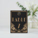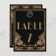 An elegant, vintage style wedding table number 7 (seven) postcard with a 1920's theme in black and shade of beige to simulate gold. A black background highlights the intricate geometric, Art Deco style border in golden tones. Both the Bride's and the Groom's monograms (initials) are highlighted by using a contrasting silver grey color font. This is a two sided version of the table number however please note that being printed on postcard cardstock, only one side has a glossy finish.