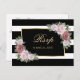 Elegant black and white floral wedding RSVP postcard featuring blush roses on a black and white striped background. Matching items available.