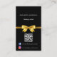 A classic black background. Decorated with a golden bown. Personalize and add your business logo, photo, name, title and contact information. Add your website url/link to the Qr code. With Facebook and Instagram icons. White text.