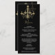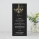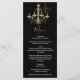 This design features elegant black background with a vintage golden color chandelier. The damask gold chandelier reflects its shadow contrasting against the black. The combination of the black and gold colors creates a sophisticated, trendy and chic style. Elegant wedding menu card design with modern elements. The simple setup of the typography gives it a distinct style. Matching wedding invitations and other stationery items are also available.