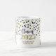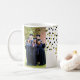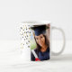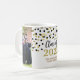 Customizable photo template class of 2025 graduation mug with gold and black confetti pattern.