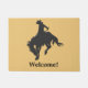 These floor mats show what everyone knows about the West. Horses buck and cowboys ride 'em! It features a black cowboy and bucking horse silhouette image on a light gold background. The text below says Welcome! but you may customize it to anything you'd like.
