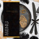 Looking for a wedding reception dinner menu? Look at our Black Gold Diamond Wedding Reception Dinner Menu! This stunning wedding luxury wedding menu features bold, modern typography with a striking digital gold effect on the frame and the word "menu" on the back. The word "Menu" dazzles with a captivating digital diamond effect, adding an extra touch of luxury. Set against a sleek black background, this design exudes elegance and sophistication, perfect for couples seeking a classy, contemporary style that stands out. Ideal for a glamorous, upscale celebration!