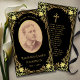 A memorial prayer card with a vintage air for a funeral. On both sides, it is black and it has an elegant baroque vintage faux gold frame. On the front, there is a vintage oval photo with faux gold border and text above and under it. The words "in loving memory" are arched above the photo. On the back there is a prayer, in caps, with a faux gold cross above it. The text is golden.