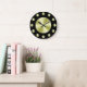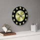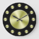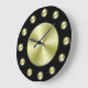 A simple wall clock with a black background, black hands and golden circles to mark the hours and cover the face. Click Customize It to add your custom text or images, change background colors and more.