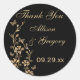 This 1.5" round amber gold and black floral wedding favor sticker or envelope seal has SIMULATED coppery gold glitter butterflies and flowery vines on it that matches the wedding invitation shown below. **NOTE, if you change the shape of the sticker yourself, or if you change the fonts, or the size of the font, some of the design and/or text may get cut-off. Everything will print as you see it on your monitor. I will not see changes you make, and Zazzle will NOT correct anything (typos, mis-alignment etc.). The text is all customizable. If you need help with this product, please email me BEFORE you place your order. If you require any other matching items, please email your request to niteowlstudio@gmail.com