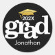 Announce to the world that your favorite grad has reached their milestone with this stunning, simple, modern, personalized sticker. Bold, graphic, faux gold foil cap icon and white typography overlay a black background. Personalize the custom text with your graduate’s name and class year. Choose from a round or square shape, in 2 sizes. Matching and coordinating invites, thank you cards, cap toppers, fans, napkins, plates, banners, yard signs, and other graduation goodies are also available in this trendy and stylish collection. Guaranteed to add stylish fun to their special occasion!
