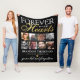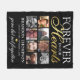 Elegant memorial keepsake blanket featuring 6 square pictures of your lost loved one, the text "forever in our hearts", their name, birth/death dates, a faux gold foil heart, and the remembrance saying "gone but not forgotten".