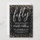 Celebrate the big 5-0 in style with this modern and festive 50th birthday party invitation. The design showcases faux shimmering gold and silver confetti across a sleek black background, with the word "Fifty" highlighted in elegant script at the top. A mix of elegant script and classic serif fonts in crisp white creates a timeless and sophisticated contrast. The back features a solid black background for a simple, polished finish. Perfect for honoring 50 years young, this invitation can be customized with your choice of font and background colors to suit any party theme.