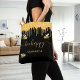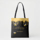 Decorated with happy, smiling bumblebees. A chic black background. Decorated with faux gold glitter drips. Yellow hand lettered script with swashes and the text: Bee Happy. Personalize and add your name.