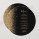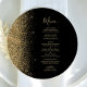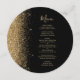 The left-hand edge of this elegant modern wedding menu features a gold faux glitter border. The customizable text combines gold-colored whimsical handwriting script and copperplate fonts on a black background. The reverse side features a matching black and gold glitter design.