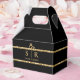 Black and gold glitter stripe wedding favor box. Personalize the monogram initials and names.