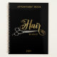 Black & Gold Hairstylist Salon Name Black Appointment book . Design Features Calligraphy ''Hair'' in gold color , pair of silver hairdressers scissors on a black background. Personalize with a name or salon name.