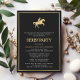 Modern, elegant gold and black Derby Party Invitation. Design featuring horse racer icon in gold color on a black background, typography script ''Derby Party'' and your party details. All text elements can be changed.