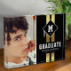 Modern guy graduation photo block featuring 2 faux gold foil stripes on a trendy black background, a photo of the grad, a motarboard with the graduates initial and class year, their name, and the school or college they graduated from.