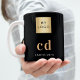 A classic black background. Personalize and add your business logo (3), a name and monogram initials (3). The name is written in white with modern white and golden block letters.